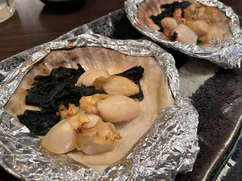 ホタテの貝焼きが絶品で、付け合わせのワカメにまでホタテの旨味がしっかり染みていました。