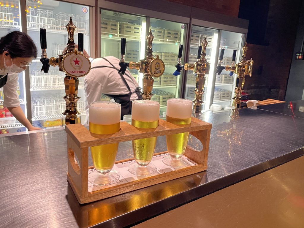 名物のジンギスカンを楽しんだあと、展示を見学してビールの飲み比べ。